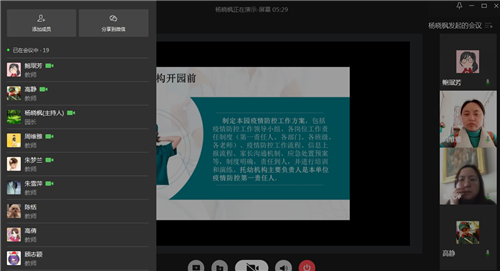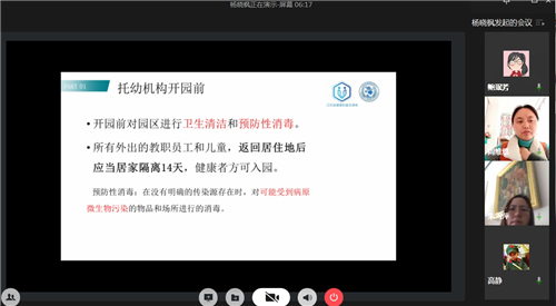 本次培训的主要内容是《托幼机构新冠肺炎防控技术方案》和《江苏省2020春季学期开学工作指引》。首先,采用视频会议集体学习的形式,杨晓枫园长结合ppt课件,组织全体教师一起学习《托幼机构新冠肺炎防控技术方案》,就托幼机构开园前、托幼机构开园后、出现疑似感染症状应急处置三个方面的具体疫情防控要求进行解读。接着,采用上传文档,自主学习的方式,布置了《江苏省2020春季学期开学工作指引》的学习任务。